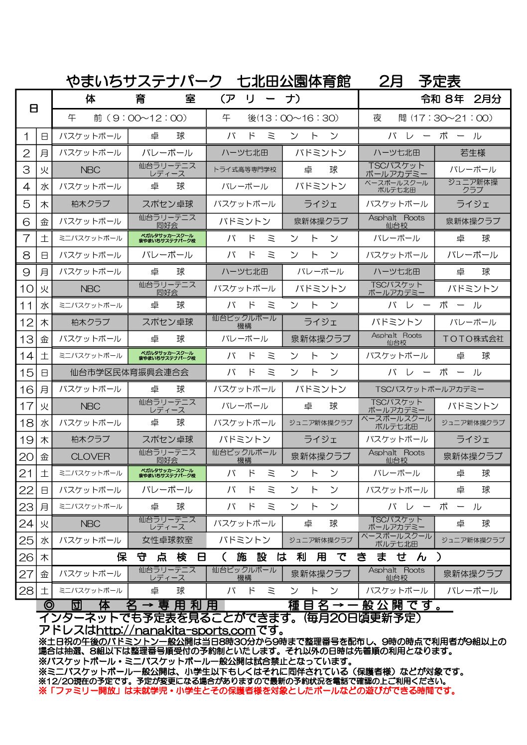 2月のアリーナ予定表を公開します!