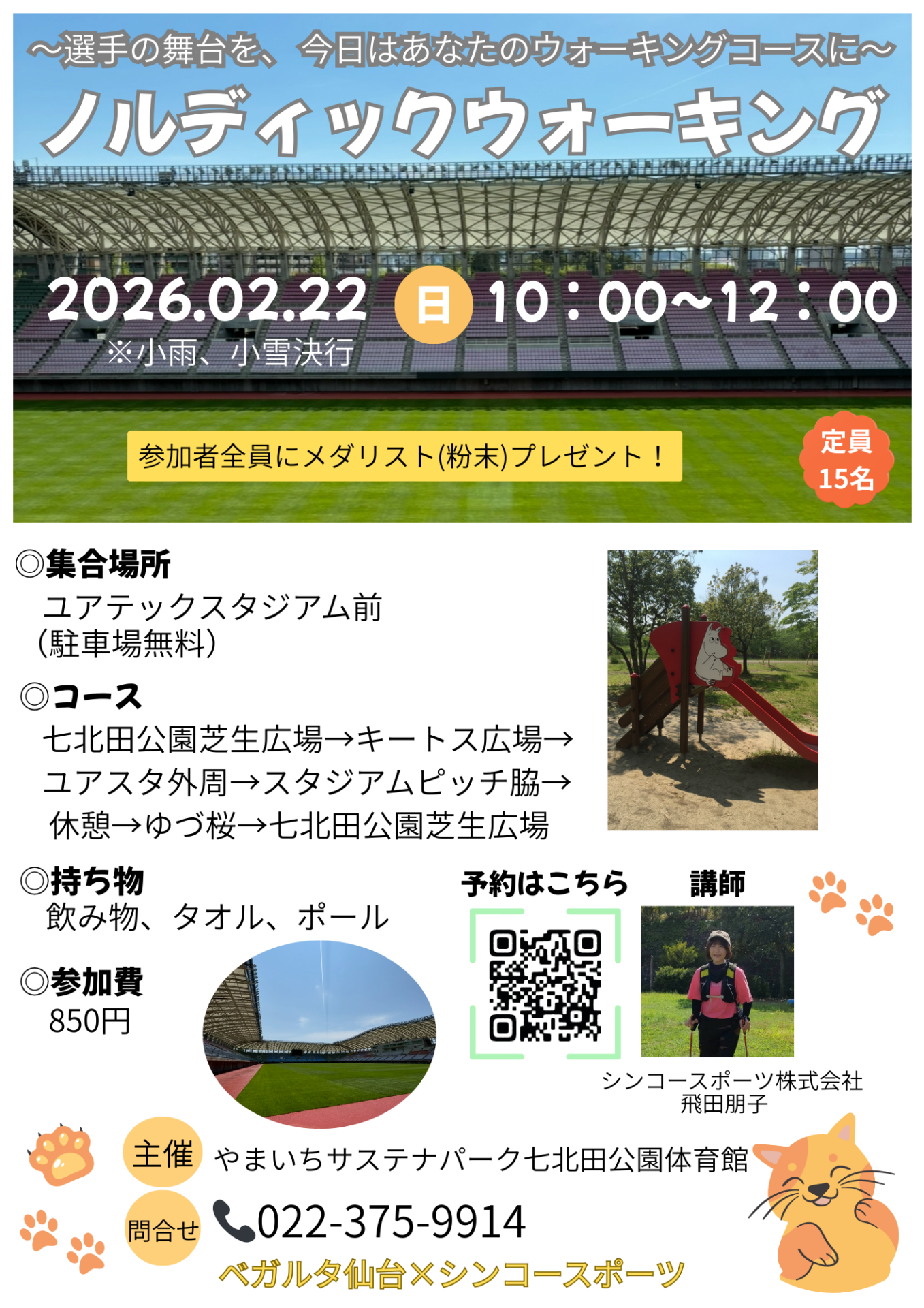 【持ち物】ポール、(無料貸し出しあり)飲み物、防寒着、※動きやすい服装でお越しください。