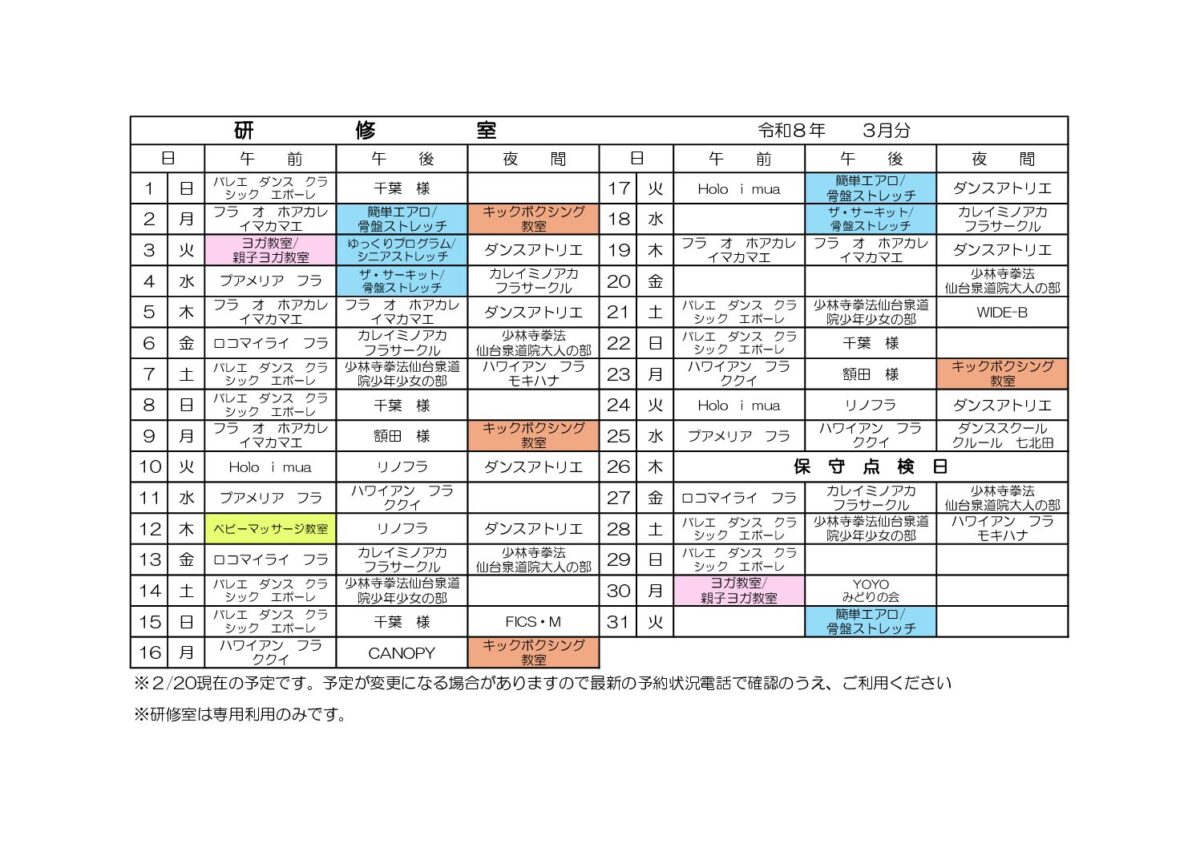 3月の研修室予定表を公開します!