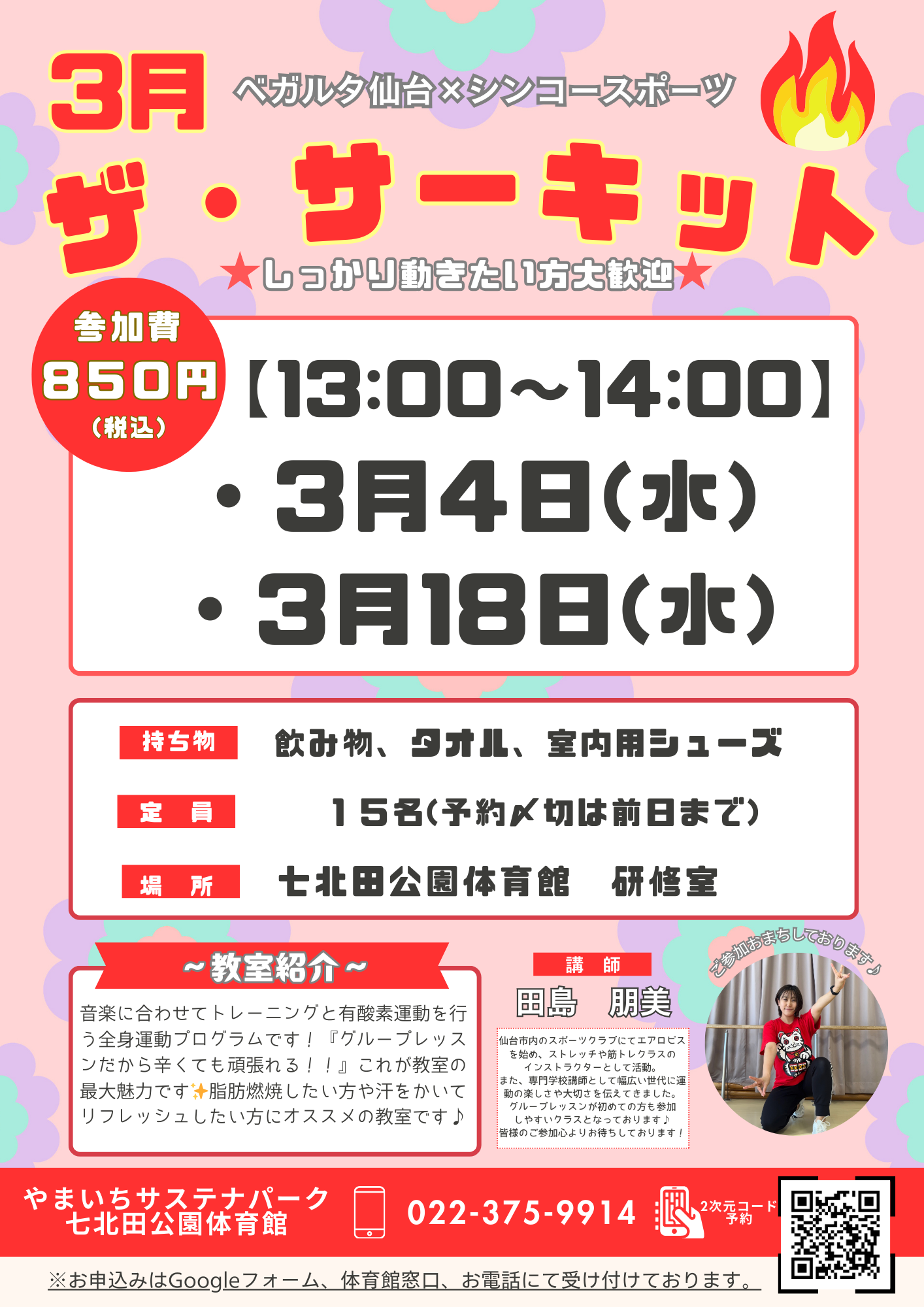 申し込み方法:Googleフォーム、体育館窓口、またはお電話での受け付けとなります。