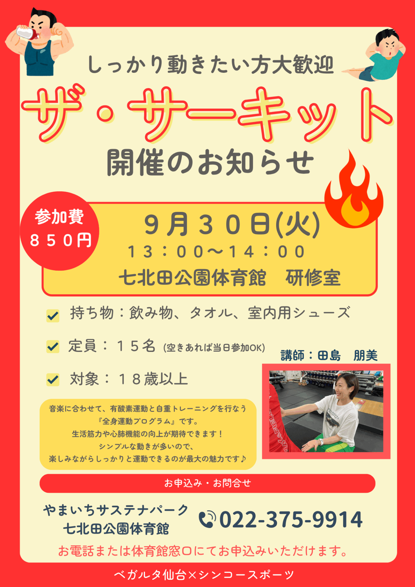 持ち物:飲み物、タオル、室内用シューズ ※動きやすい服装でお越しください。