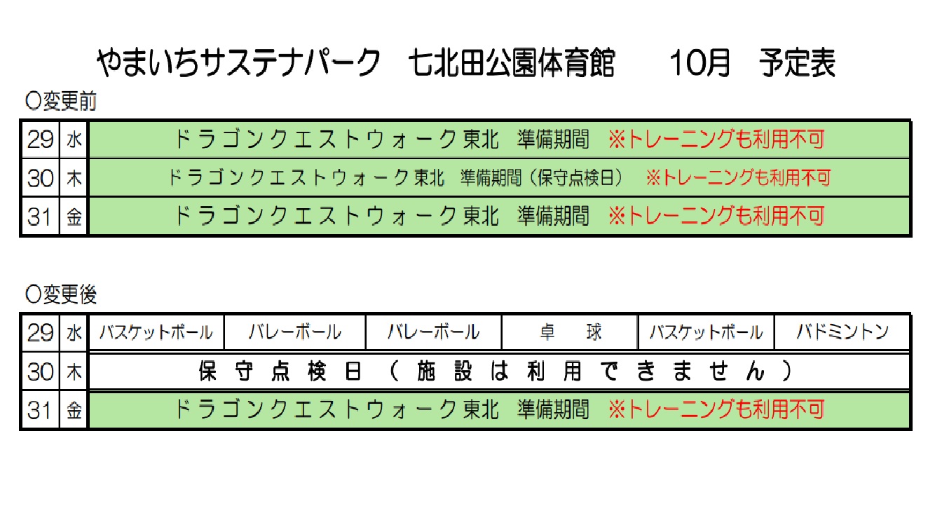 このたび、当ホームページに掲載しておりました「10月アリーナ予定表」に一部変更箇所がございます。