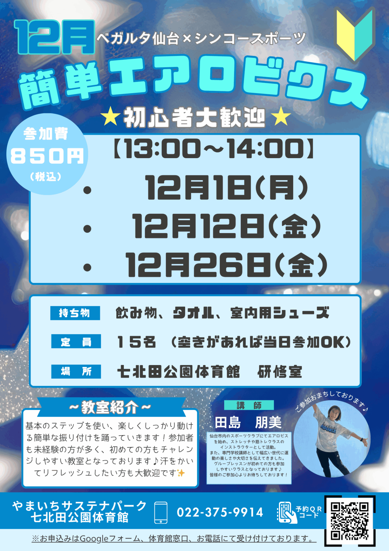 申し込み方法:Googleフォーム、体育館窓口、またはお電話での受け付けとなります。