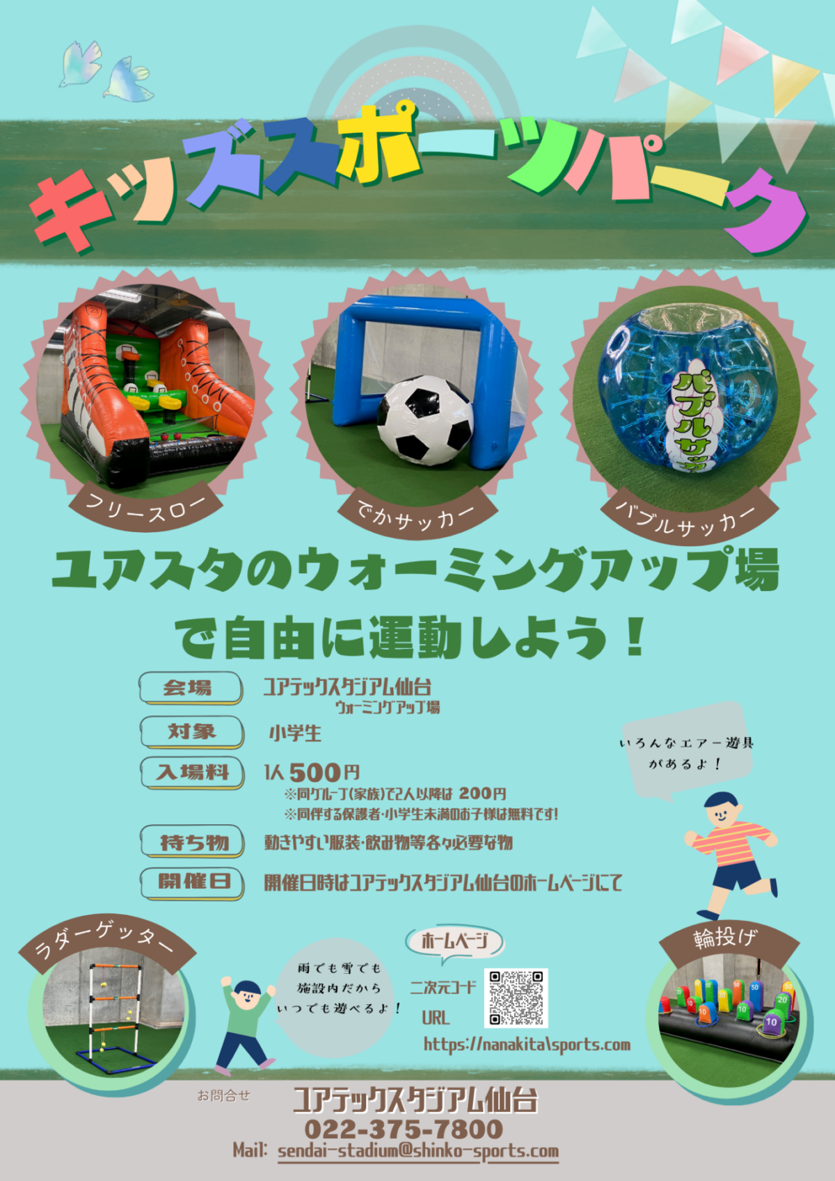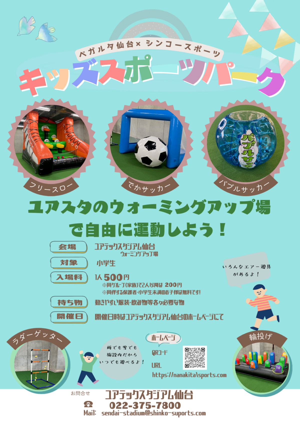 ベガルタ仙台の選手が普段使うウォーミングアップ場が、特別な遊び場に大変身!キッズスポーツパークで、忘れられない思い出を作ろう!