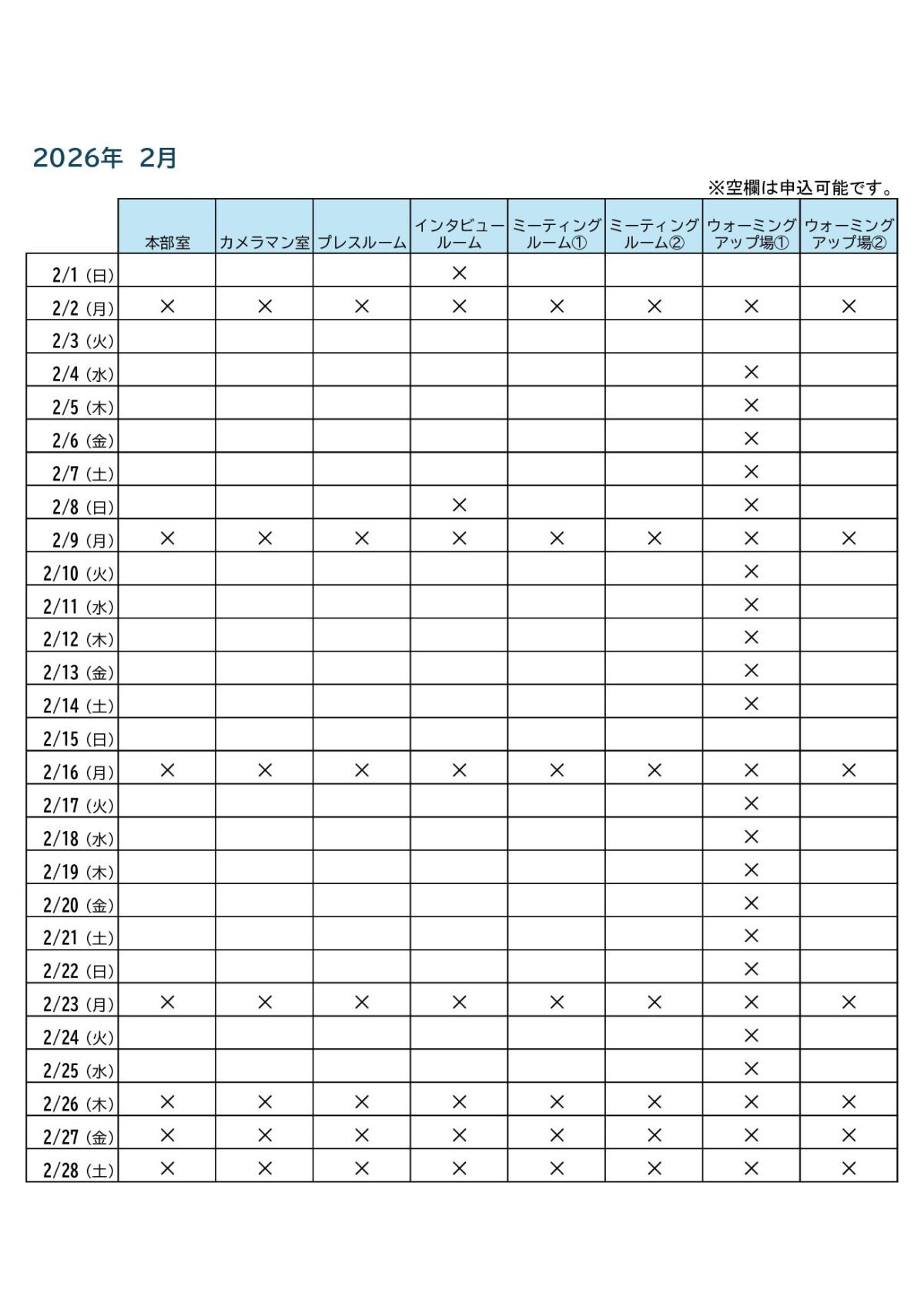 2月の諸室利用可能日公開しました!
