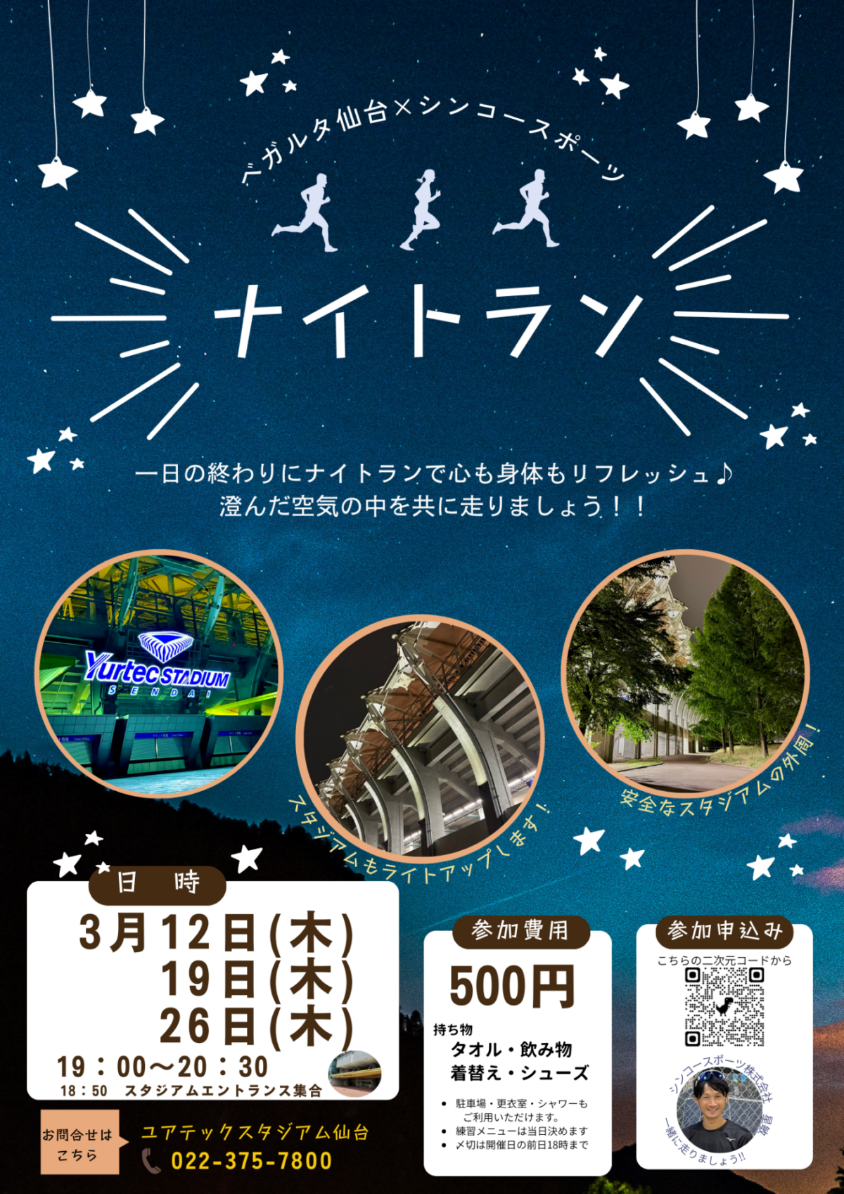 初心者の方も、普段から夜ラン派の方も、夜はまだ未経験という方もこの機会にライトアップしたスタジアム周りを一緒に走りましょう!