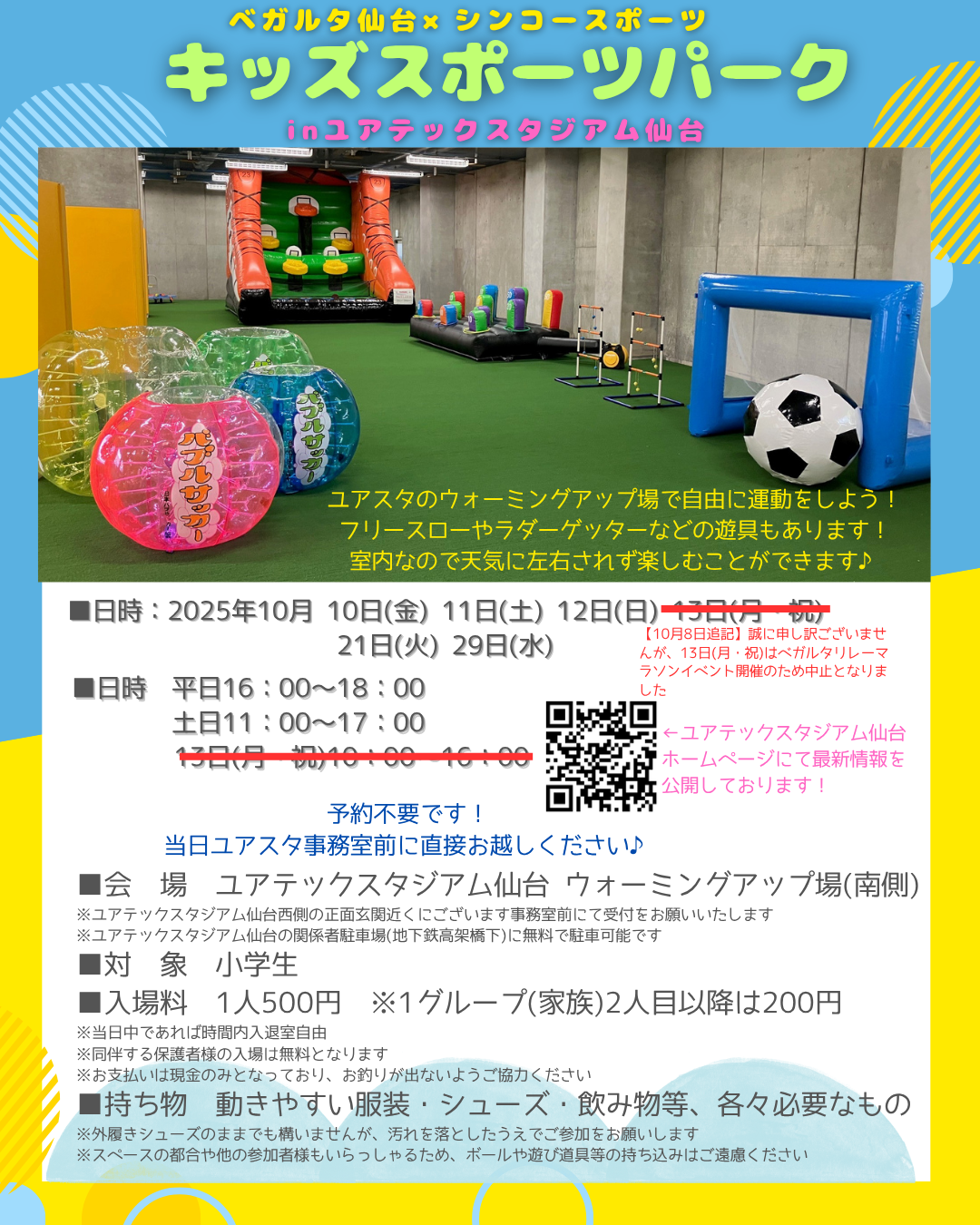 ベガルタ仙台の選手が普段使うウォーミングアップ場が、特別な遊び場に大変身! キッズスポーツパークで、忘れられない思い出を作ろう!